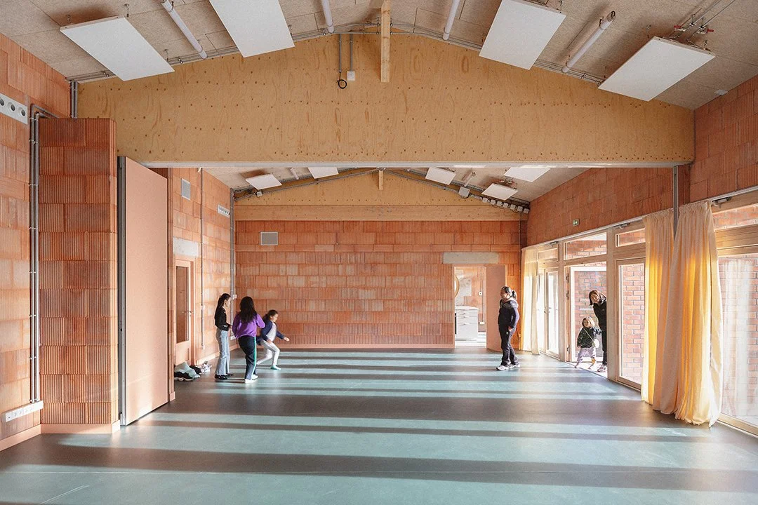 Le projet concerne un ERP de plain-pied, composé de façades porteuses en maxibrique, d’éléments en béton, d’une charpente en bois lamellé-collé et de quelques linteaux métalliques. La structure intérieure est volontairement très épurée, laissant la charpente apparente. Le cloisonnement est réalisé en brique creuse laissée visible.