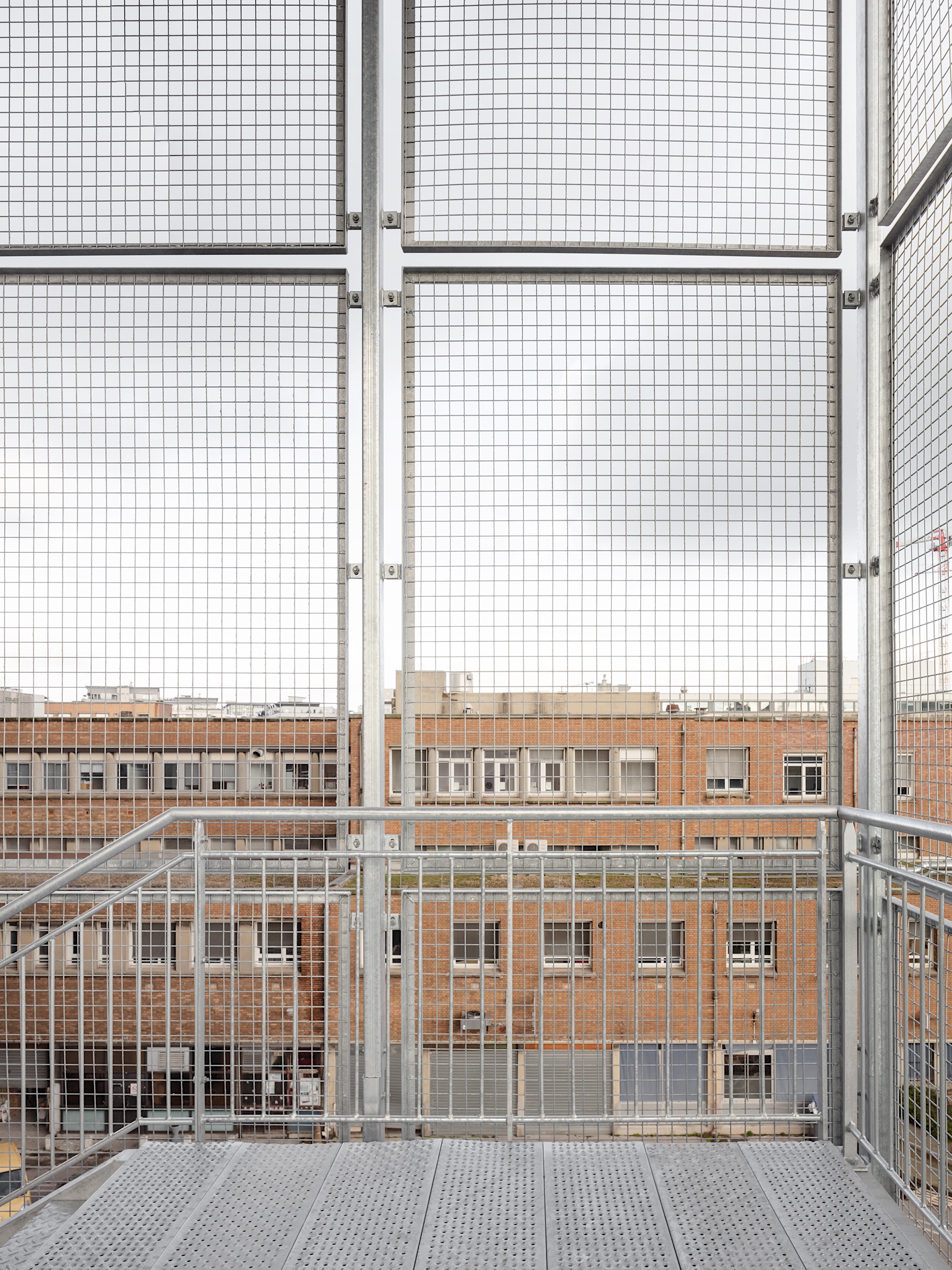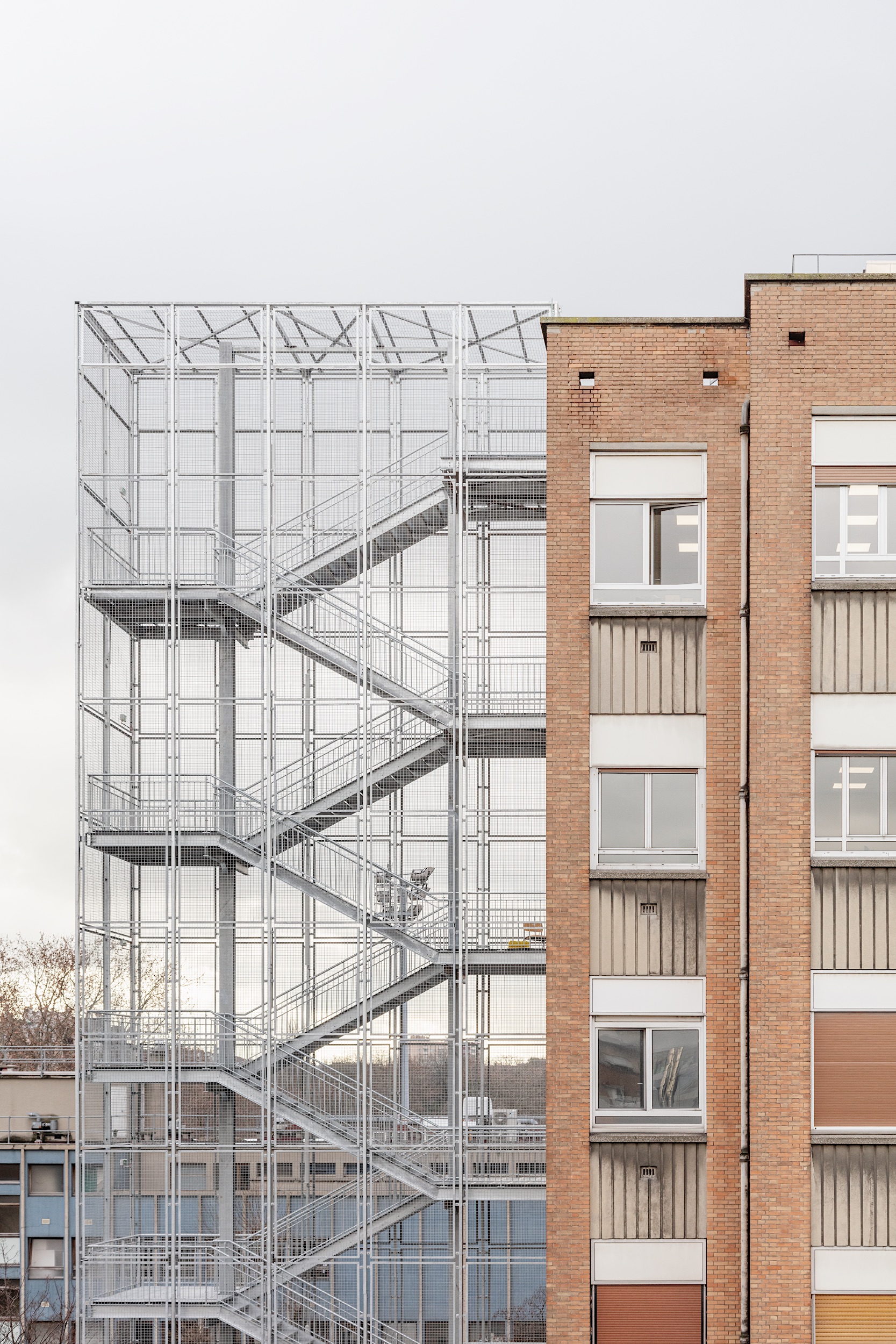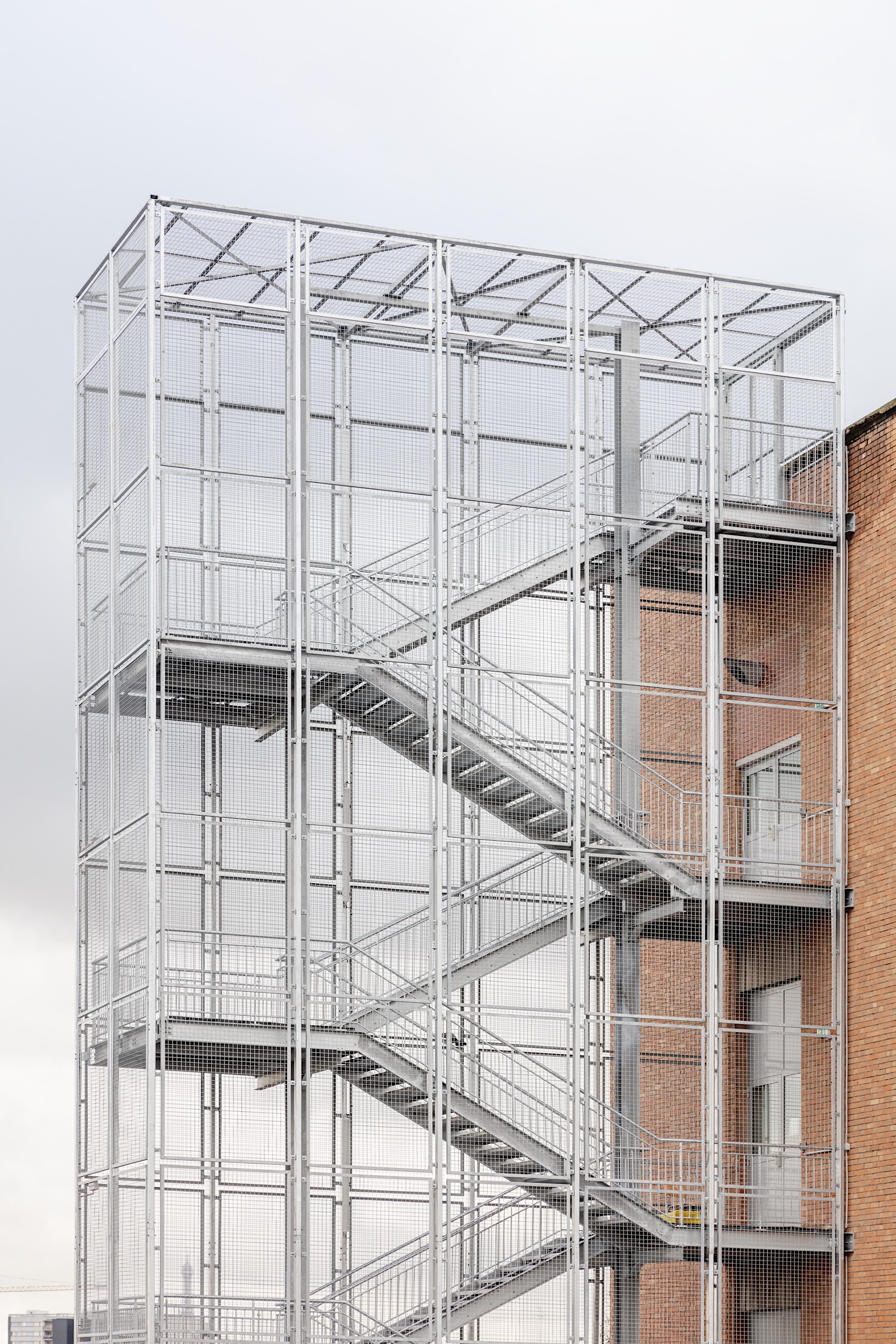 Le projet consiste à créer un escalier de secours extérieur venant s’adosser au bâtiment existant de l’hôpital, avec desserte des niveaux RDC à R+5 ainsi que de la toiture. L’intervention implique une insertion très précise dans l’existant, avec le traitement des accès à chaque niveau, la création de façades et d’enveloppes associées à l’ouvrage, ainsi que des éléments de fermeture et de protection tels que portes, portillon, grillage à maille carrée et plinthes acier galvanisé. La lecture des plans montre également une attention particulière portée aux raccordements en pied d’ouvrage et aux interfaces avec les façades est et nord du bâtiment existant.