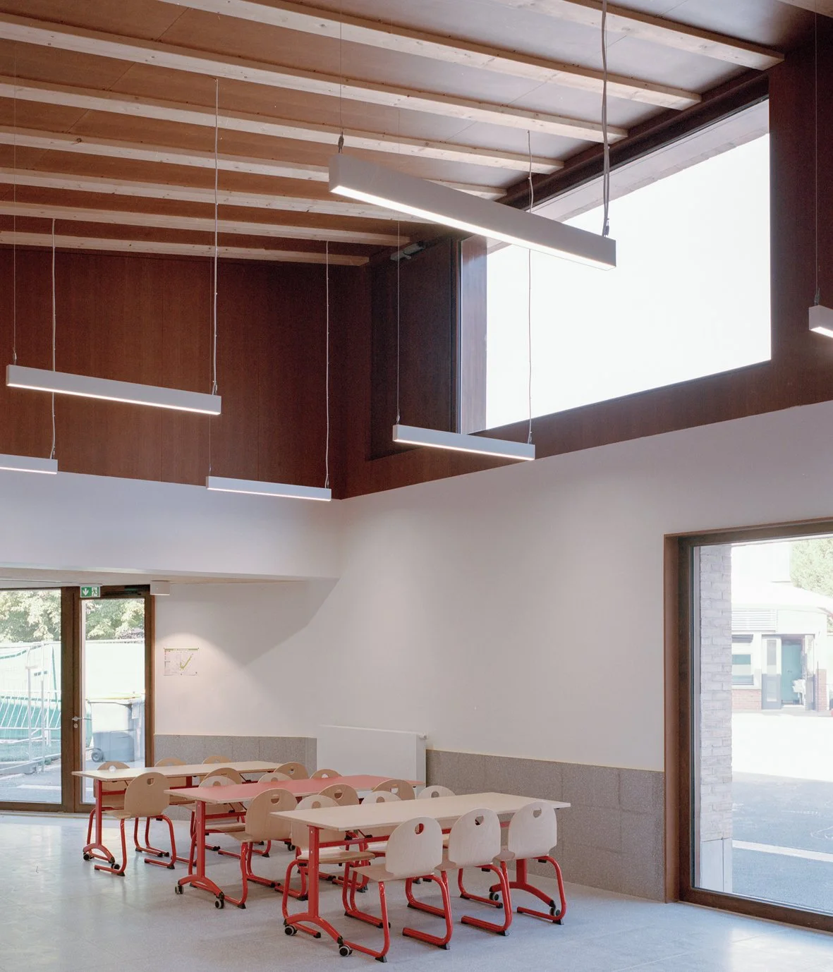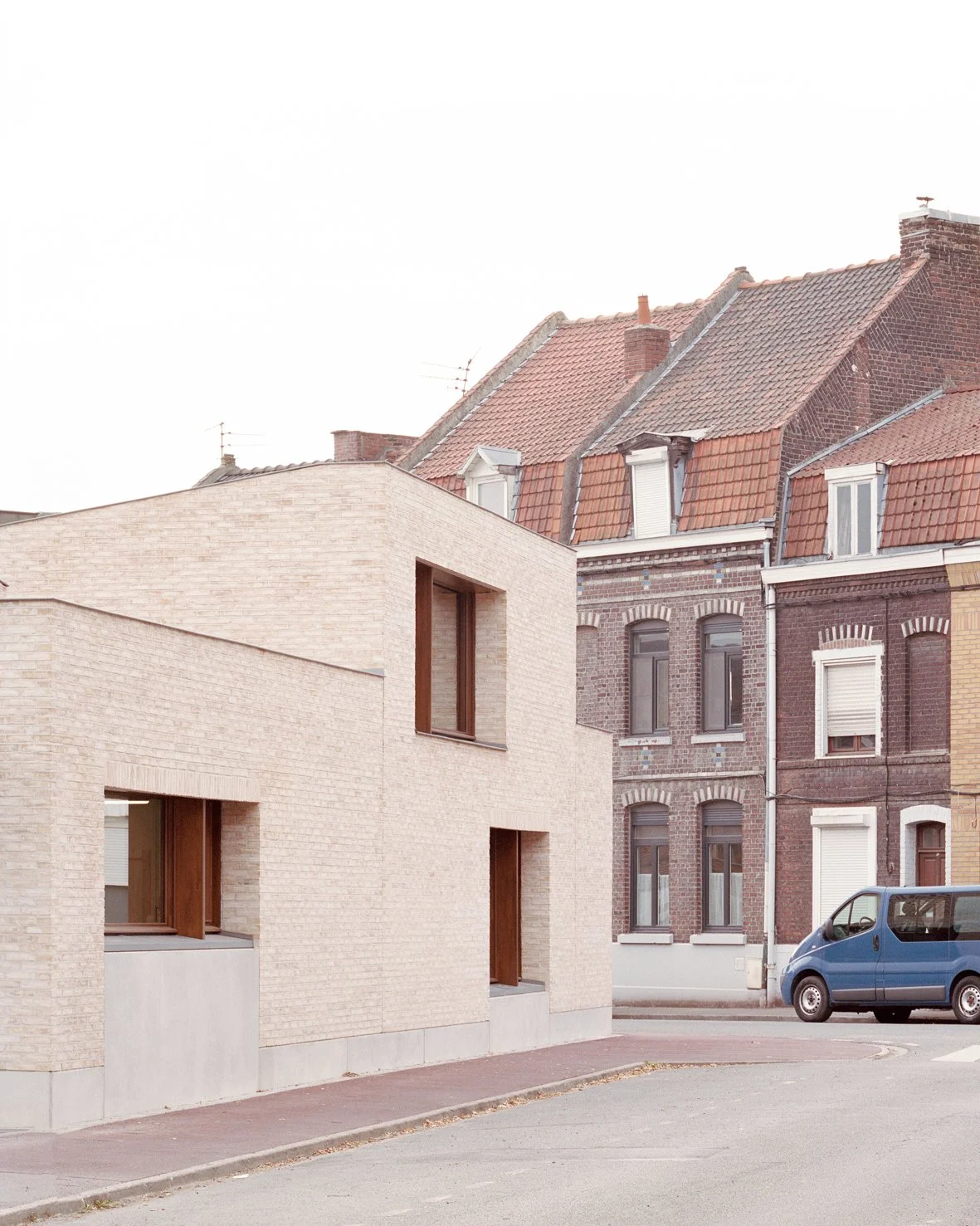 Le projet se distingue par une écriture constructive sobre et robuste, fondée sur des élévations de type mur double avec brique creuse porteuse, ITI, lame d’air et rangée de brique pleine en façade. La toiture-terrasse est conçue en béton pour les surfaces courantes et en bois pour les excroissances support de zinc, ce qui traduit une vraie mixité constructive au service de l’architecture. L’ensemble s’inscrit en outre dans une démarche visant à maîtriser l’impact carbone du projet et à valoriser la noblesse des matériaux employés.