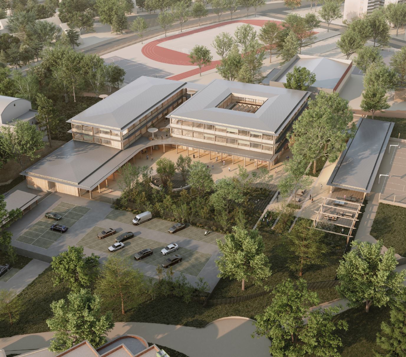 Le corps principal du collège se découpe en deux bâtiments en R+2, liaisonnés au RDC par le réfectoire et au R+1 par une grande toiture terrasse accessible, et sont constitués d’une structure mixte bois-béton répartie comme suit :