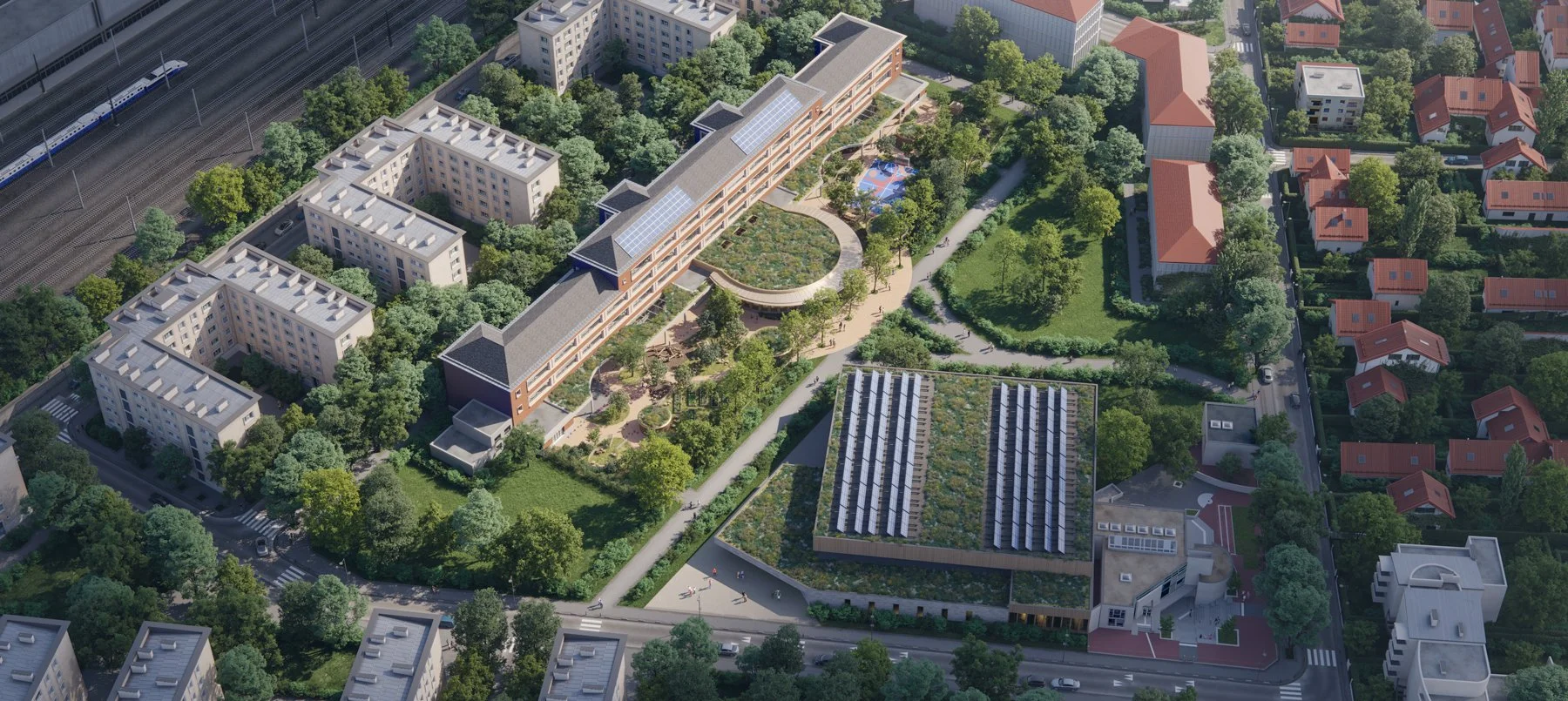 Le projet présente des enjeux techniques forts liés à l’intervention sur un bâtiment existant à valeur patrimoniale, classé comme élément bâti remarquable au PLU, tout en y adossant une extension neuve et une profonde reconfiguration fonctionnelle. L’opération doit regrouper école élémentaire, école maternelle, centre de loisirs et restauration dans un ensemble unique, avec un chantier mené en deux phases et le maintien en fonctionnement d’une partie des locaux existants pendant les travaux. À cela s’ajoutent des objectifs environnementaux élevés, avec un bâtiment neuf à énergie positive, une réhabilitation de niveau BBC rénovation, la gestion des eaux pluviales par infiltration, la lutte contre les îlots de chaleur et la végétalisation des toitures et espaces extérieurs.